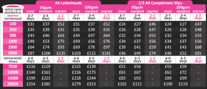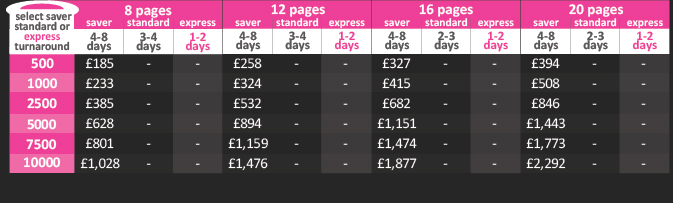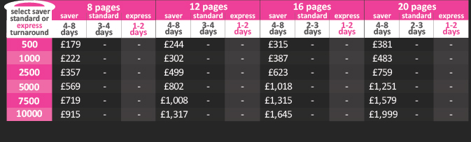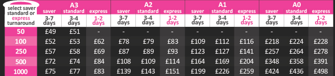 Prices are for full colour and include delivery – for any variations please contact us for a quote