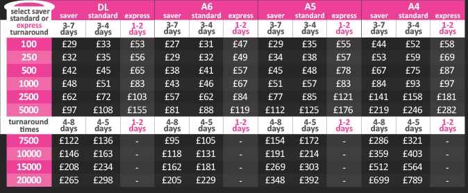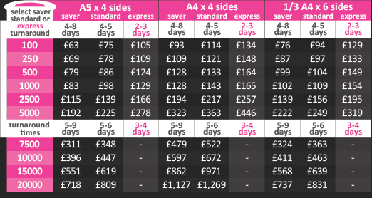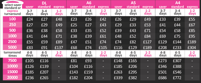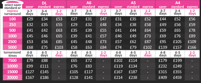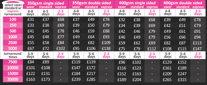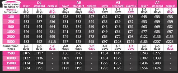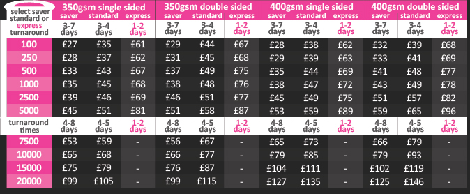 Prices are for premium quality, full colour, double sided printing and includes delivery.